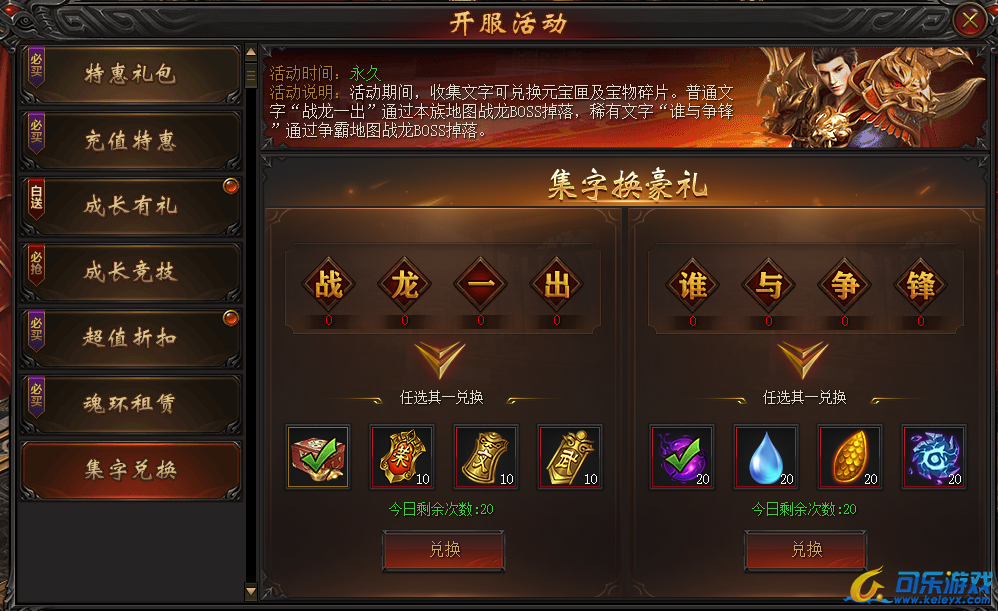 活动说明:每日通过击杀BOSS收集“战龙一出 谁与争锋”文字道具,即可在界面兑换稀有道具!