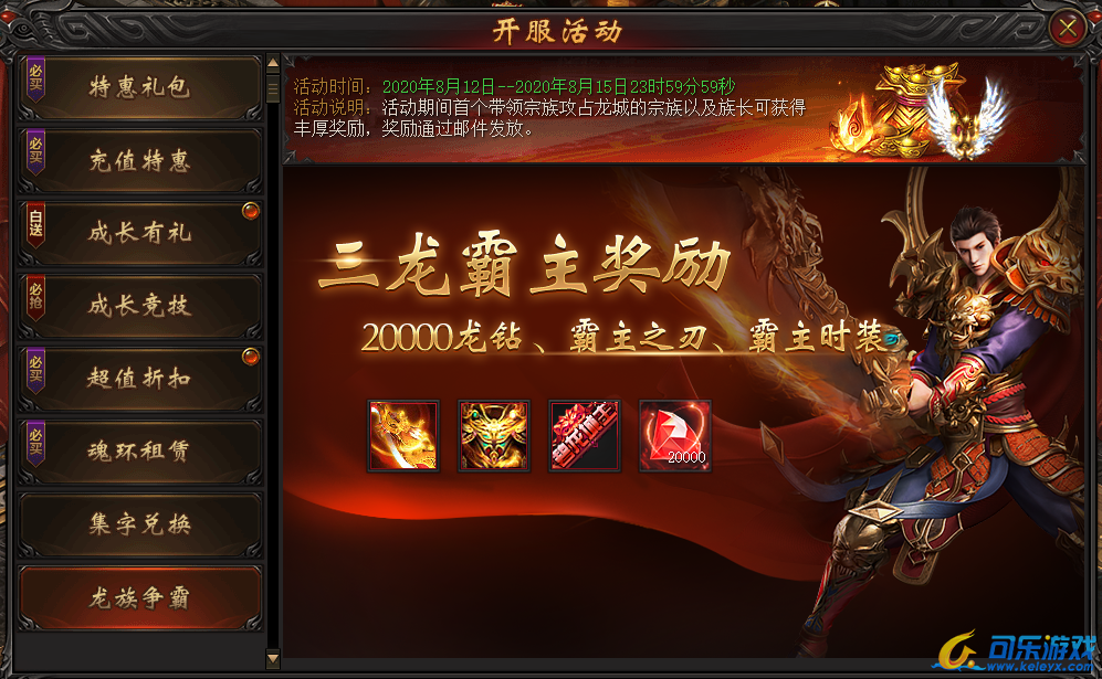 活动说明:开服第四天,开启“龙城争霸”活动,需报名后参与。开服首次龙城称霸的占领帮会以及帮主可获得丰厚奖励,奖励通过邮件发放!