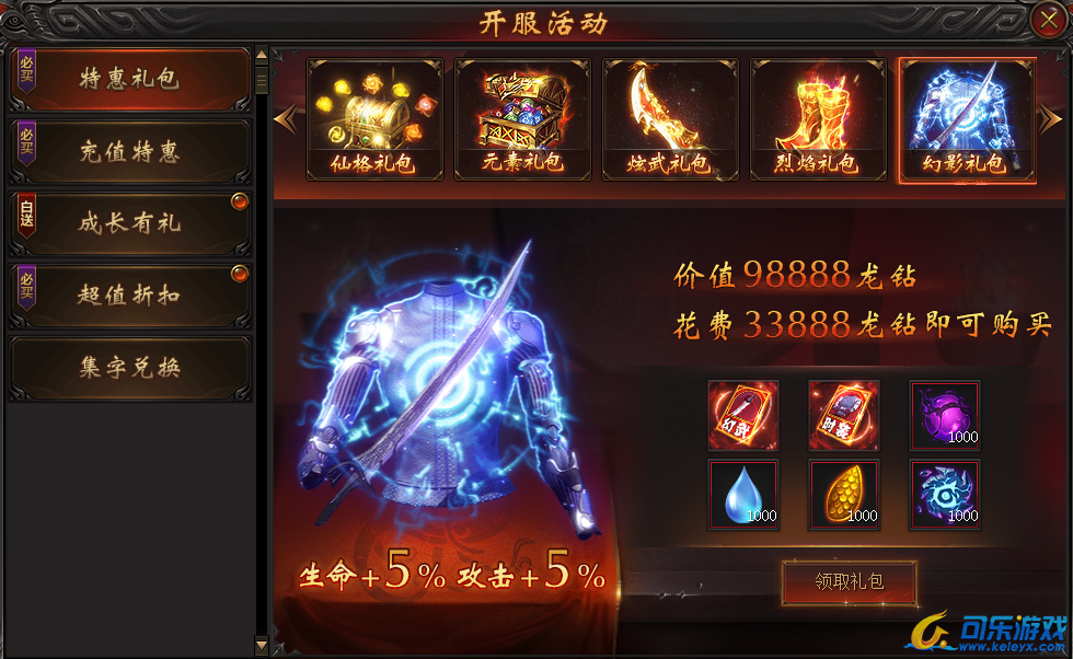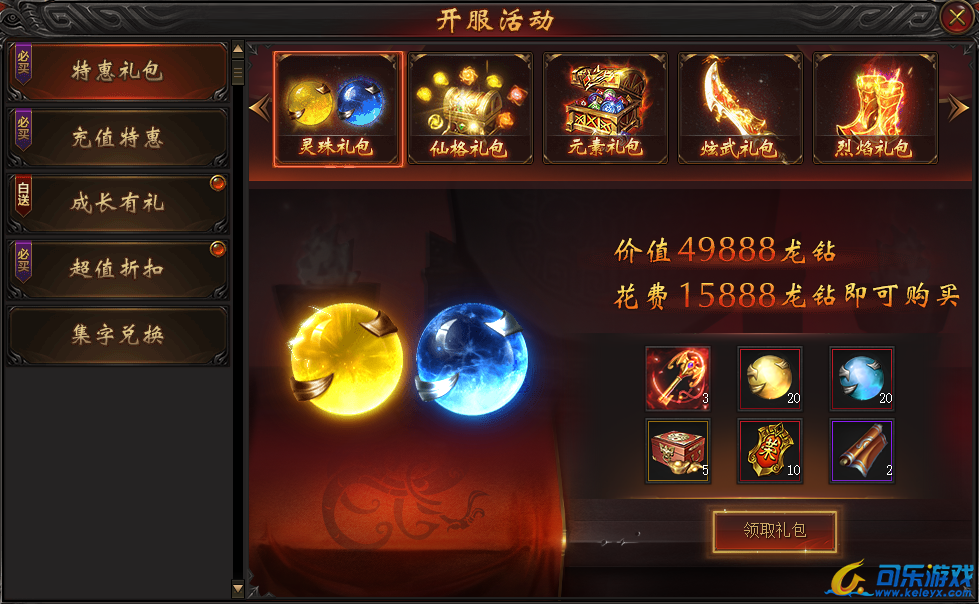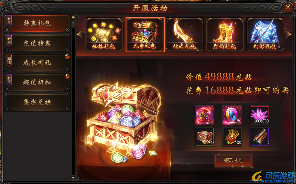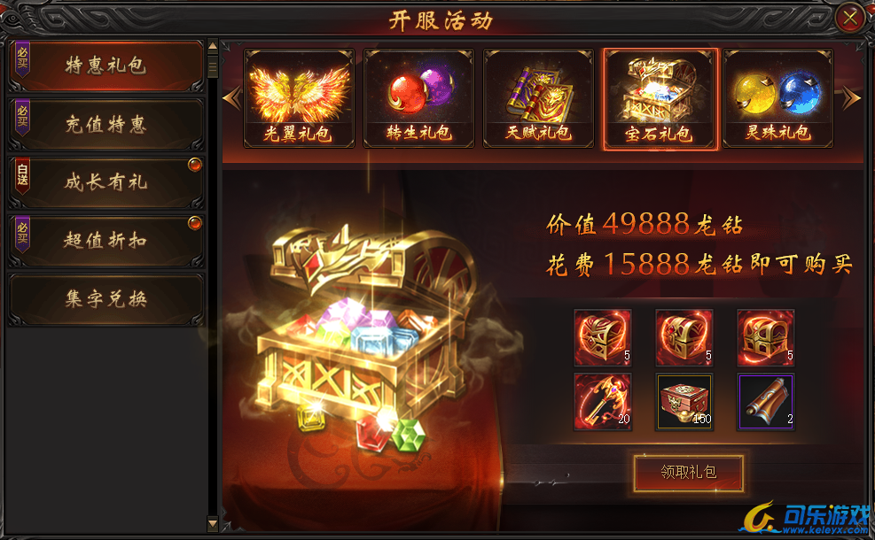 说明:开服第五天即可购买。购买礼包可得高等级宝石及大量元宝,助力提升战力迅速升级!