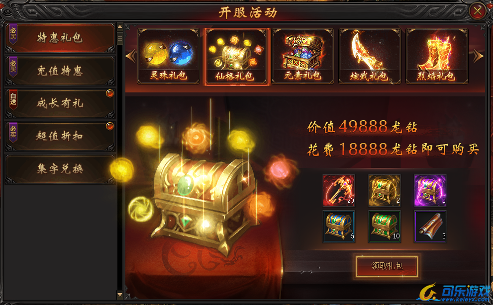 说明:开服第七天即可购买。购买礼包即可获得海量仙格,助您快速提升战力!
