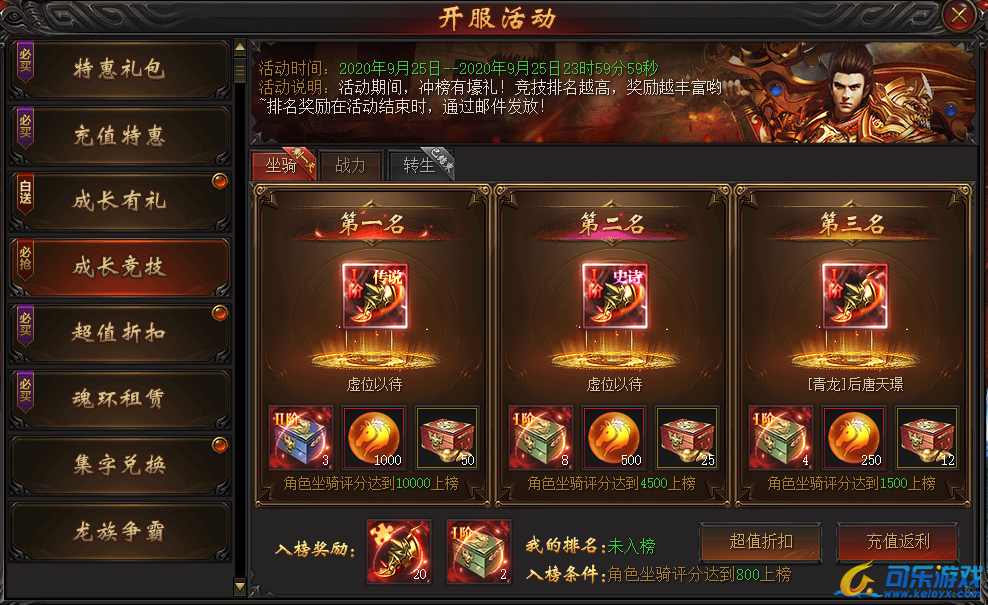 说明:开服第二天,角色坐骑评分满足条件即可上榜,最终排名越高奖励越丰富