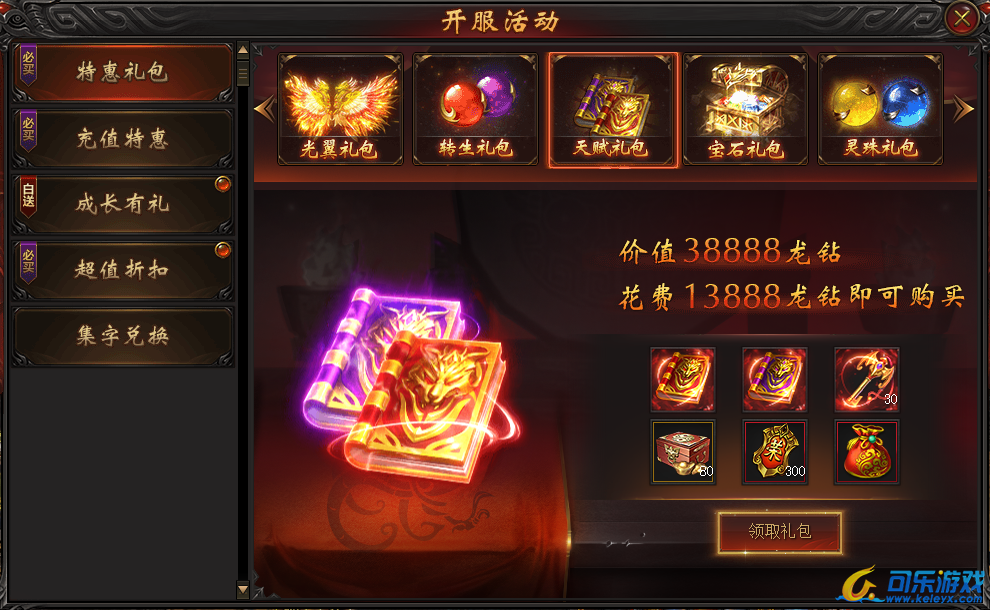 说明:开服第五天即可购买。购买礼包可得超稀有天赋书,天赋多1点,属性暴涨一大截!还有大量元宝荣誉,助力提升战力!