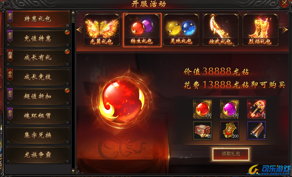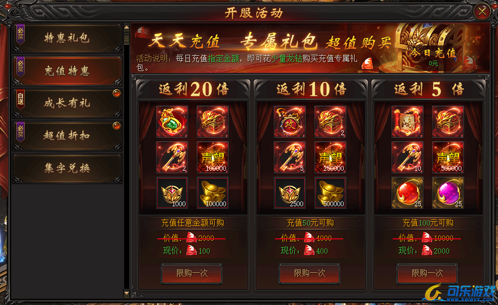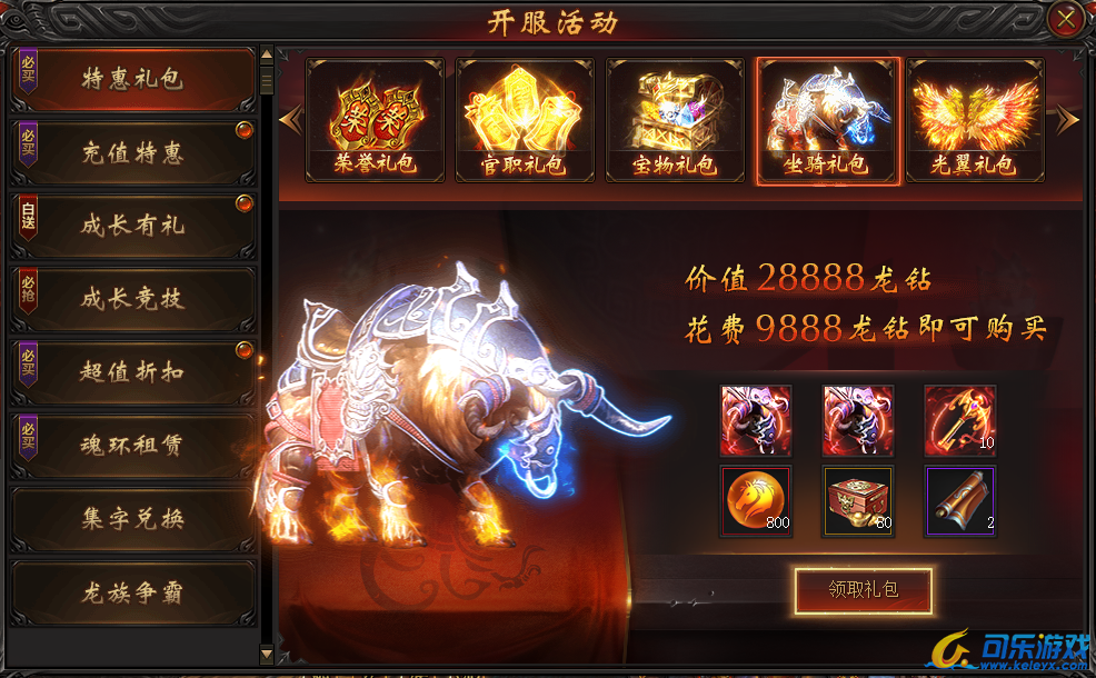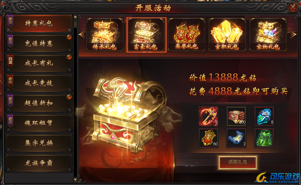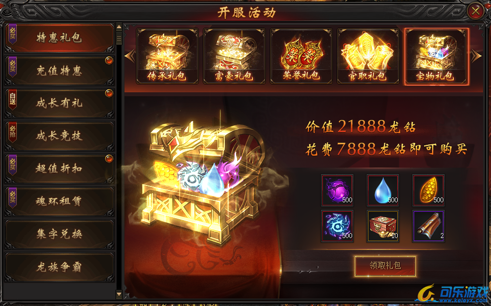 说明:开服特惠礼包,随开服天数逐步开放,终身只可购买一次!各种稀有珍品助您称霸战龙!