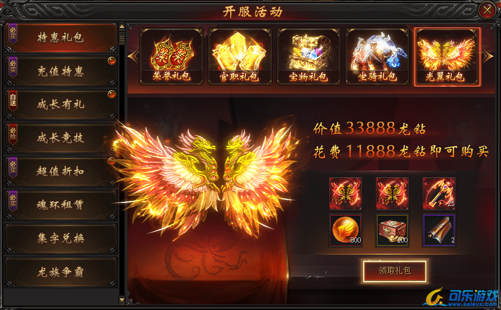 说明:开服第三天即可购买。购买礼包可得两个炫酷光翼及大量光翼升阶材料,实乃提升光翼必备之良品!