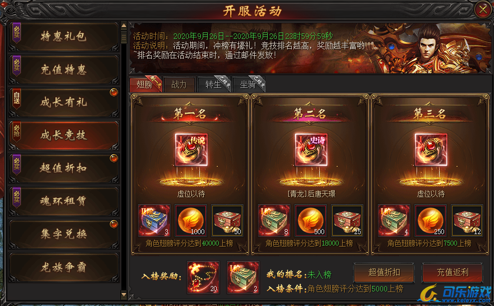 说明:开服第三天,角色翅膀评分满足条件即可上榜,最终排名越高奖励越丰富