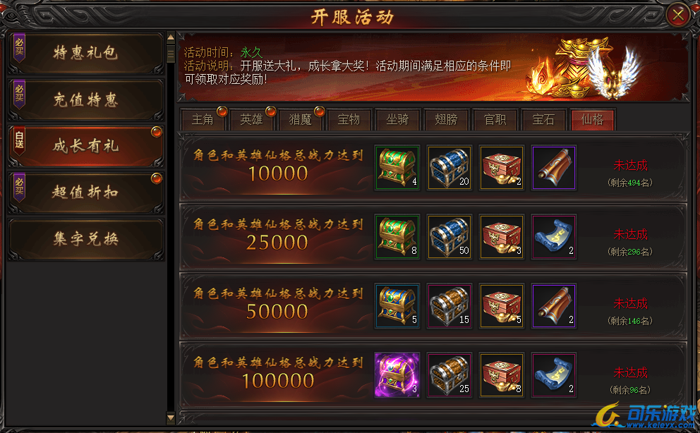 说明:活动期间仙格等阶满足条件即可领取大量奖励