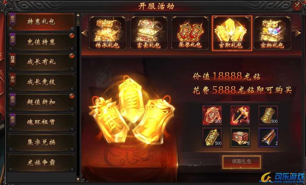 说明:开服第二天即可购买。购买礼包即可获得官职大礼包,高人一等,PK威慑对手,刀刀附加额外伤害!