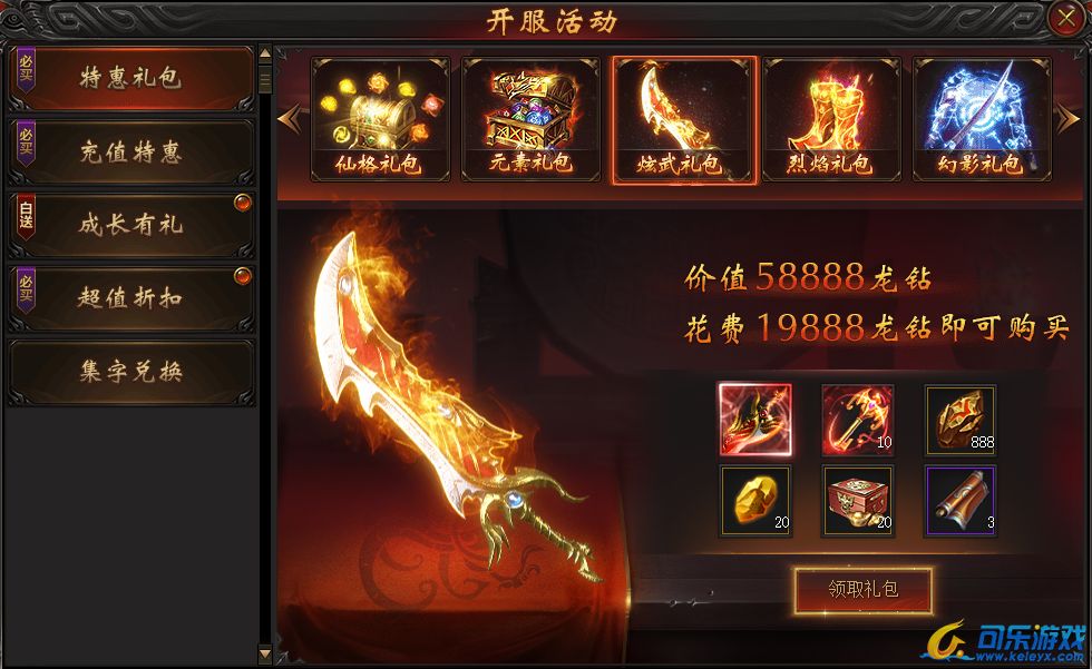 说明:开服第一天即可购买。购买礼包可得超强“屠龙”之刃,极品武器在手,PK何须第二刀!
