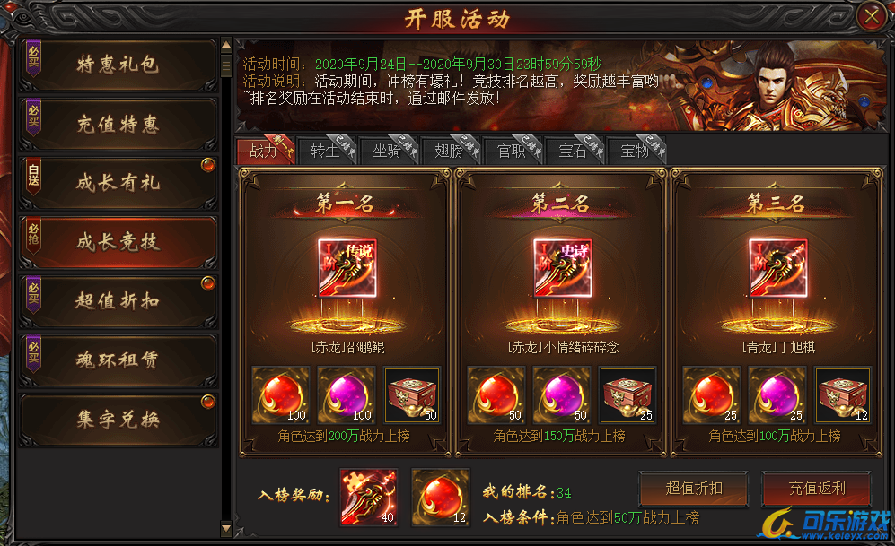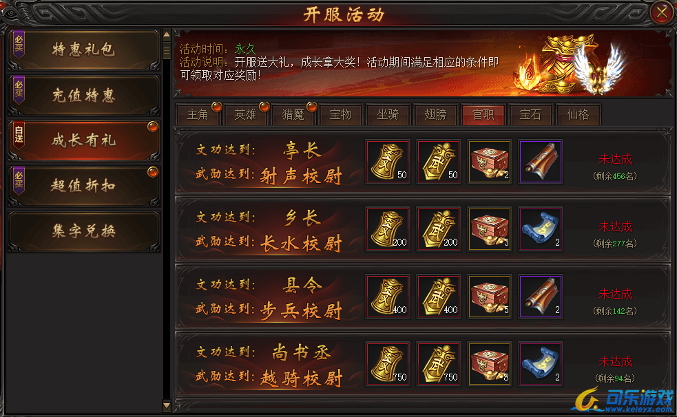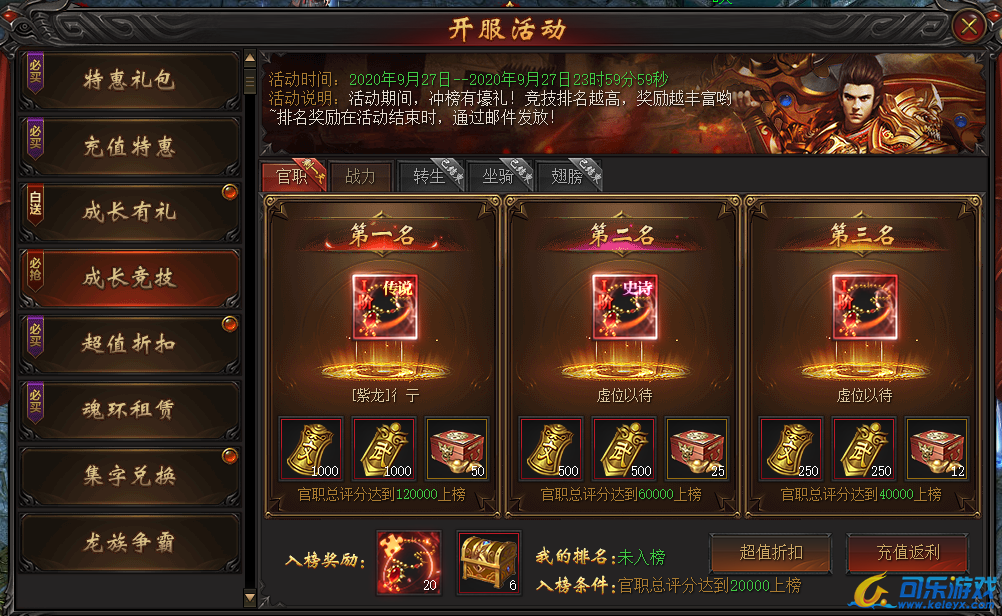 说明:开服第四天,活动期间官职总评分满足条件即可上榜,最终排名越高奖励越丰富