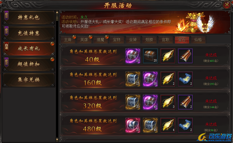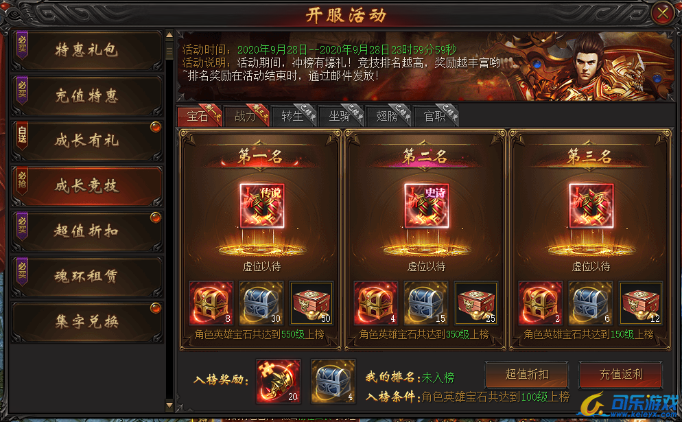 说明:开服第五天,活动期间角色英雄宝石总等级满足条件即可上榜,最终排名越高奖励越丰富