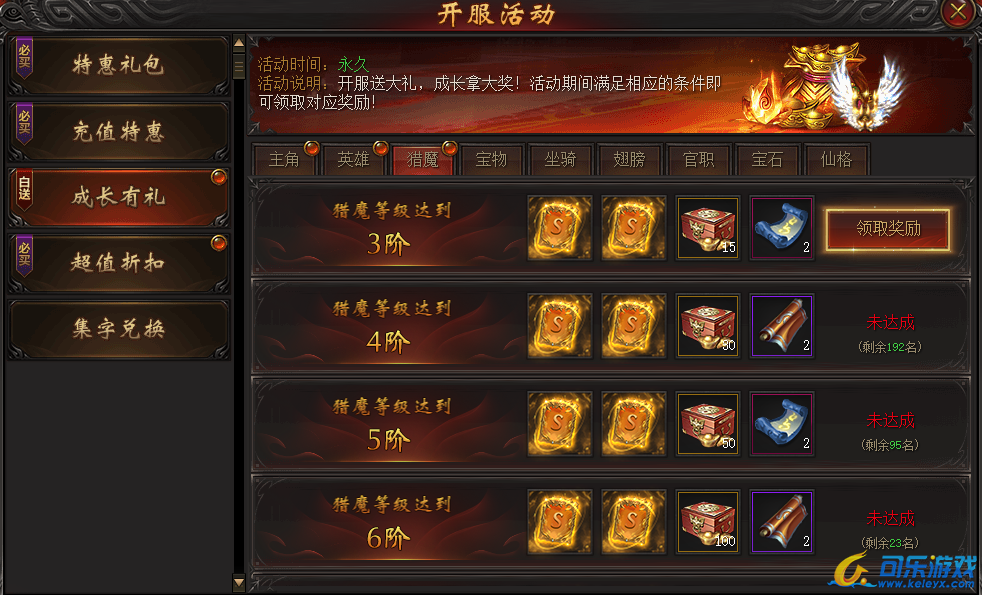 说明:活动期间猎魔等阶满足条件即可领取大量奖励