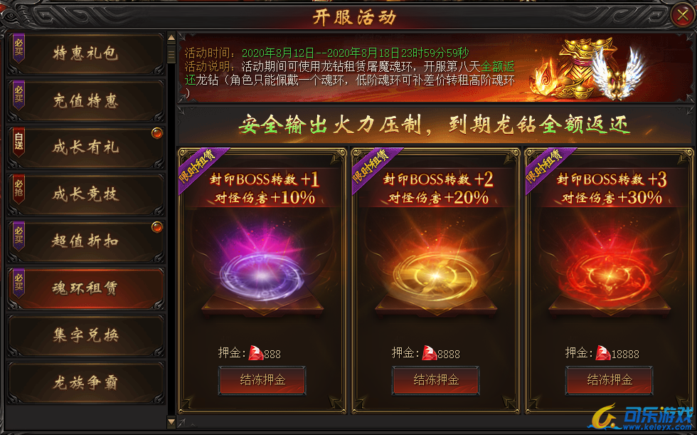 活动说明:活动期间可用龙钻租赁屠魔魂环,开服第八天全额返还龙钻(只可租赁其中一个,低价魂环可补差价转租高阶魂环),提升对怪伤害及免伤,提升打宝效率