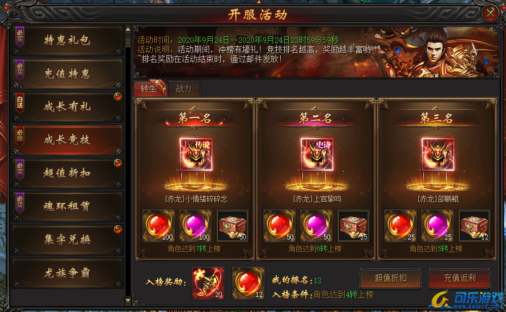说明:开服第一天,角色转生等级满足条件即可上榜,最终排名越高奖励越丰富