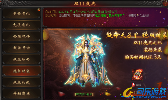 活动说明 : 活动期间,可在活动界面购买绝版时装“甄命天子甲”,使用后永久生效。