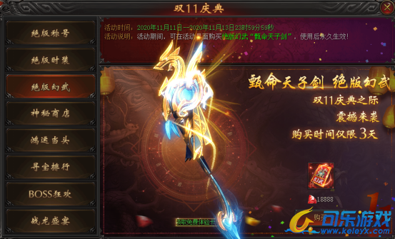 活动说明 : 活动期间,可在活动界面购买绝版幻武“甄命天子剑”,使用后永久生效。