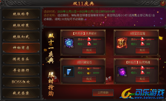 活动说明 : 活动期间,神秘商店倾情促销稀有材料!商店物品每2小时自动刷新(或全商品全部已购后),消耗199龙钻可手动刷新。