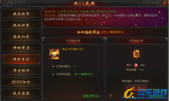 活动说明 : 玩家每消耗1988龙钻即可获得一个1-100之间的幸运数字。每日21点抽取今日幸运数字,拥有该数字的玩家即可获得今日鸿运大奖。