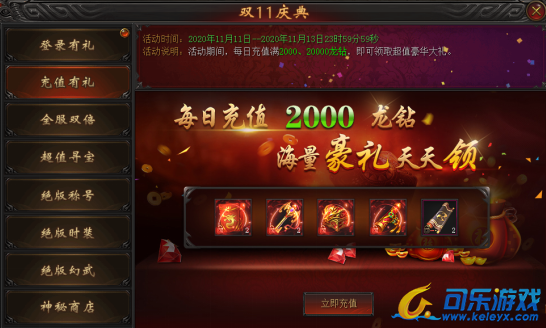 活动说明:活动期间,每日充值满2000、20000龙钻!还能领取超值豪华大礼