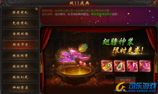 活动说明:活动期间,轮回神装概率翻倍,翅膀神装限时抽取!