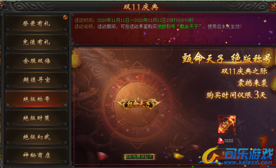 活动说明 : 活动期间,可在活动界面购买绝版称号“甄命天子”,使用后永久生效。