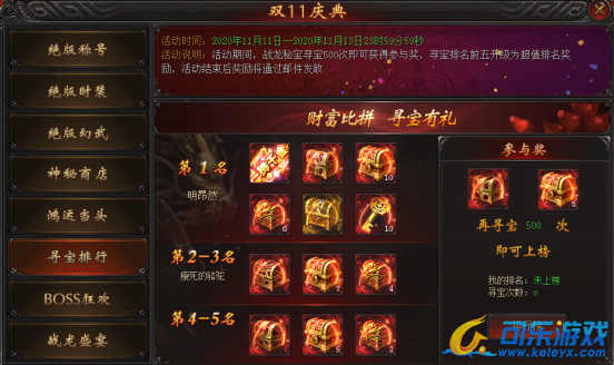 活动说明:活动期间,战龙秘宝寻宝500次即可获得参与奖,寻宝排名前五升级为超值排名奖励,活动结束后奖励将通过邮件发放。
