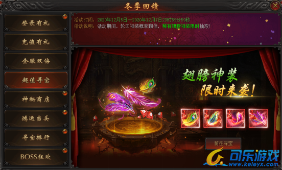 活动说明:活动期间,轮回神装概率翻倍,翅膀神装限时抽取!