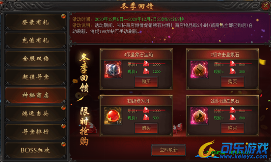 活动说明 : 活动期间,神秘商店倾情促销稀有材料!商店物品每2小时自动刷新(或全商品全部已购后),消耗199龙钻可手动刷新。