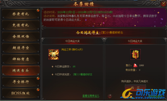 活动说明 : 玩家每消耗1988龙钻即可获得一个1-100之间的幸运数字。每日21点抽取今日幸运数字,拥有该数字的玩家即可获得今日鸿运大奖。