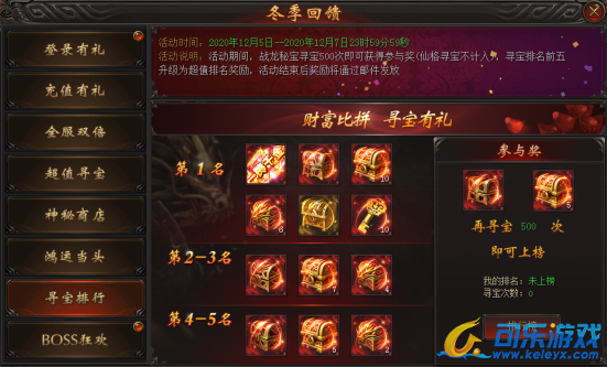 活动说明:活动期间,战龙秘宝寻宝500次即可获得参与奖,寻宝排名前五升级为超值排名奖励,活动结束后奖励将通过邮件发放。