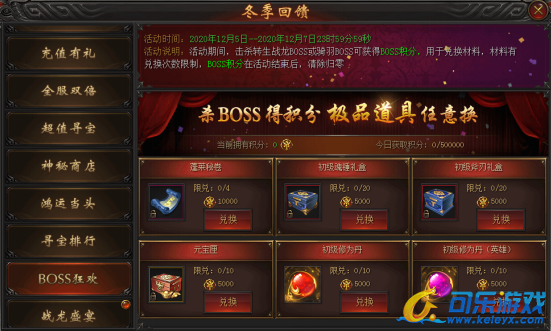 活动说明 : 活动期间内,击杀BOSS获得“boss积分”,“boss积分”可用于兑换材料,每种材料均有兑换次数限制,“boss积分”在活动结束后,清除归零