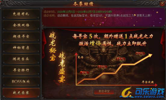 活动说明:活动期间,在战龙秘宝中,每寻宝5次,可额外获得1点战龙之力,获取无上限!