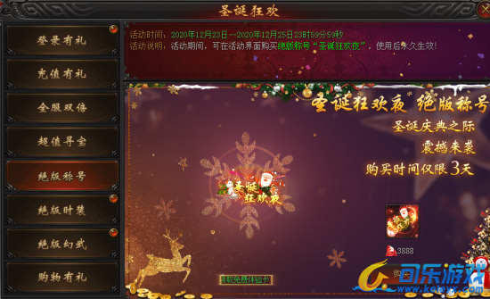 活动说明 : 活动期间,可在活动界面购买绝版称号“圣诞狂欢夜”,使用后永久生效。