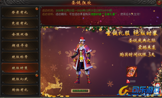 活动说明 : 活动期间,可在活动界面购买绝版时装“圣诞礼服”,使用后永久生效。