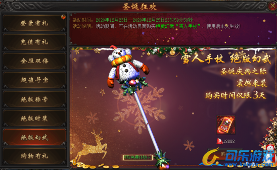 活动说明 : 活动期间,可在活动界面购买绝版幻武“雪人手杖”,使用后永久生效。