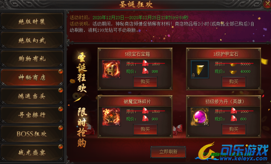 活动说明 : 活动期间,神秘商店倾情促销稀有材料!商店物品每2小时自动刷新(或全商品全部已购后),消耗199龙钻可手动刷新。