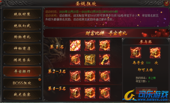 活动说明:活动期间,战龙秘宝寻宝500次即可获得参与奖,寻宝排名前五升级为超值排名奖励,活动结束后奖励将通过邮件发放。