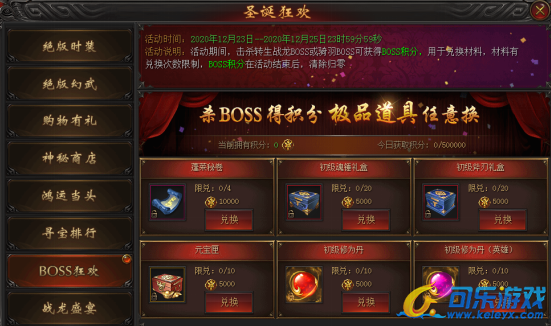 活动说明 : 活动期间内,击杀BOSS获得“boss积分”,“boss积分”可用于兑换材料,每种材料均有兑换次数限制,“boss积分”在活动结束后,清除归零