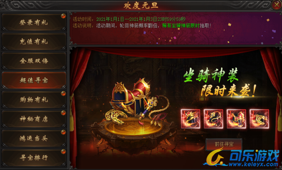 活动说明:活动期间,轮回神装概率翻倍,坐骑神装限时抽取!