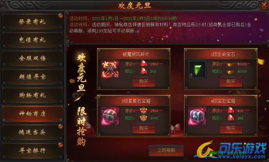 活动说明 : 活动期间,神秘商店倾情促销稀有材料!商店物品每2小时自动刷新(或全商品全部已购后),消耗199龙钻可手动刷新。