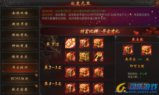活动说明:活动期间,战龙秘宝寻宝500次即可获得参与奖,寻宝排名前五升级为超值排名奖励,活动结束后奖励将通过邮件发放。