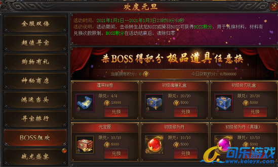 活动说明 : 活动期间内,击杀BOSS获得“boss积分”,“boss积分”可用于兑换材料,每种材料均有兑换次数限制,“boss积分”在活动结束后,清除归零
