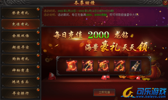 活动说明:活动期间,每日充值满2000、20000龙钻!还能领取超值豪华大礼