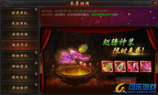 活动说明:活动期间,轮回神装概率翻倍,翅膀神装限时抽取!