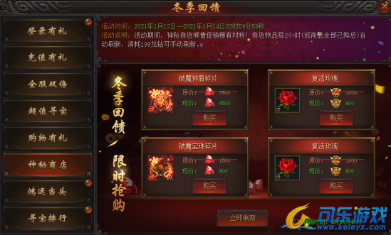 活动说明 : 活动期间,神秘商店倾情促销稀有材料!商店物品每2小时自动刷新(或全商品全部已购后),消耗199龙钻可手动刷新。