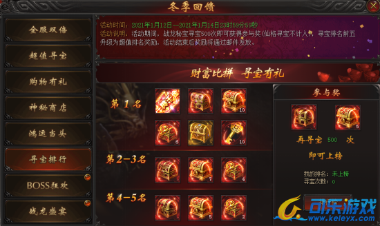 活动说明:活动期间,战龙秘宝寻宝500次即可获得参与奖,寻宝排名前五升级为超值排名奖励,活动结束后奖励将通过邮件发放。