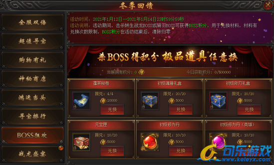 活动说明 : 活动期间内,击杀BOSS获得“boss积分”,“boss积分”可用于兑换材料,每种材料均有兑换次数限制,“boss积分”在活动结束后,清除归零