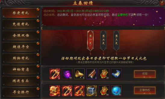 活动说明:活动期间,每日登录游戏可领取奖励,激活至尊特权可额外领取一份!