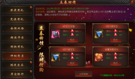 活动说明 : 活动期间,神秘商店倾情促销稀有材料!商店物品每2小时自动刷新(或全商品全部已购后),消耗199龙钻可手动刷新。