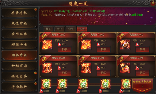 活动说明:活动期间,在活动界面购买特惠商品,消耗龙钻数量达到进度可获得额外奖励!