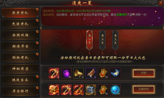 活动说明:活动期间,每日登录游戏可领取奖励,激活至尊特权可额外领取一份!